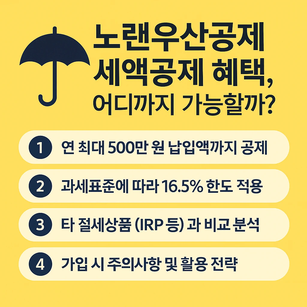 소상공인과 자영업자라면 한 번쯤 들어본 노란우산공제, 하지만 실제 세액공제 혜택이 어디까지 가능한지 제대로 알고 계신 분은 많지 않습니다. 정부는 경기침체 속에서 자영업자 보호와 노후대비 지원을 위해 세액공제 혜택을 크게 강화해왔습니다. 특히 2025년 현재 연간 최대 500만 원 납입금액에 대해 소득 수준에 따라 최대 16.5% 세액공제를 받을 수 있어 절세 전략으로 각광받고 있습니다. 이 글에서는 노란우산공제를 통한 절세 효과, 실제 세액공제 계산 방법, 다른 절세상품과의 비교, 가입 시 주의사항까지 모두 정리해드리겠습니다. 끝까지 읽으시면 ‘나는 어디까지 공제를 받을 수 있을까?’에 대한 해답을 얻으실 수 있습니다.
