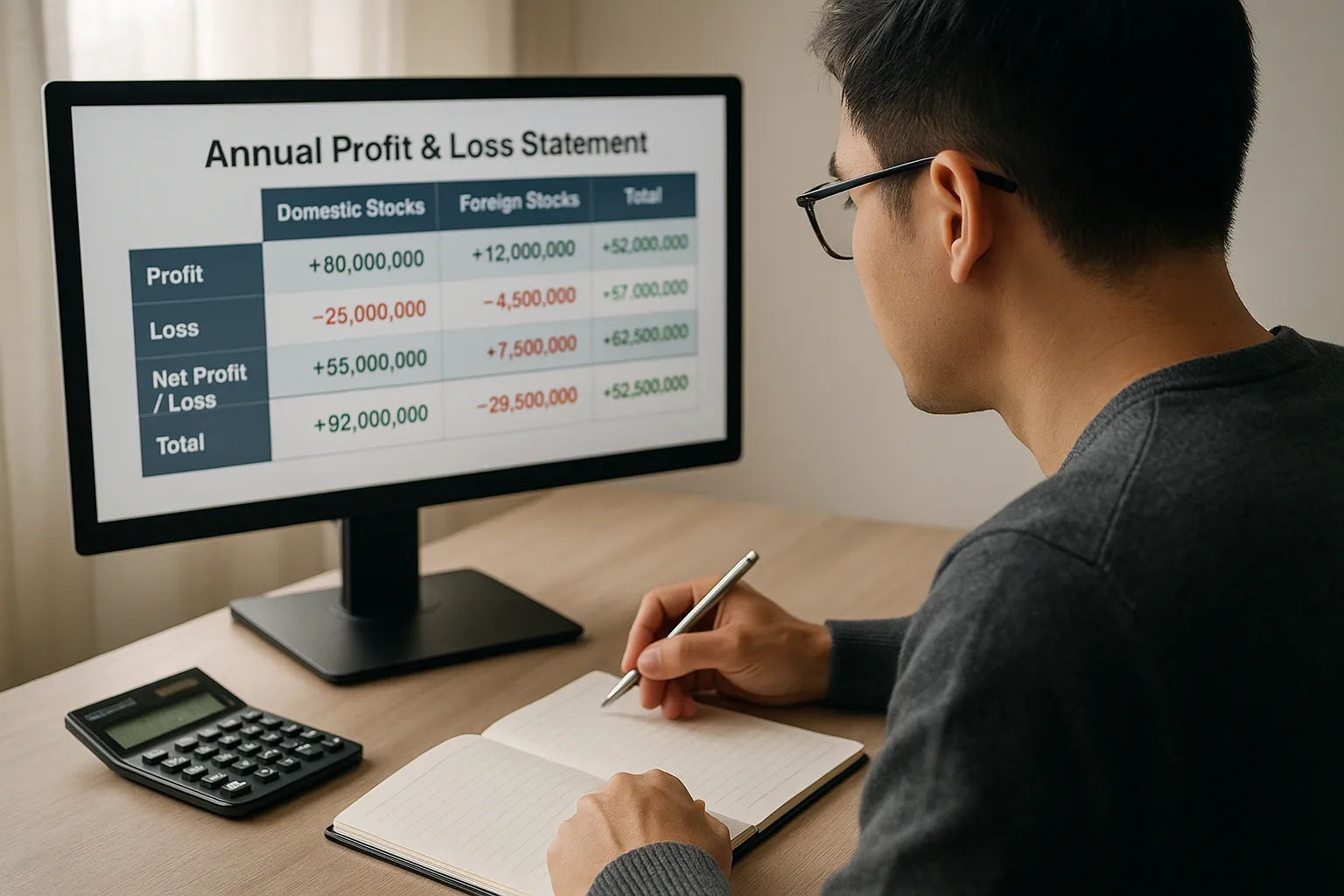 바로 실행 ─ ① 연간손익내역(국내·해외) 다운로드 → ② 손익통산 후 순이익 계산 → ③ 기본공제 5,000만 원 반영 → ④ 순손실은 5년 이월공제 등록 → ⑤ 홈택스 신고 준비.